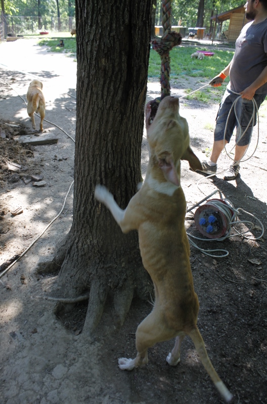 Prnjavorin tarhalla käynti oli pysäyttävä. Saavuimme suuren hallin edustalle ja pihalla oli paljon koiria metalliketjuissa ja monet koirat olivat ilman koirankoppeja tai ilman mitään suojaa. Joillakin koirilla oli vain vanha ovi aitaa vasten, jonka alle pääsi suojaan pahinta kuumuutta. Ajattelin heti seuraavana, että mitenkähän nämä koirat selviävät talvella. Tarhan omistaja, Bojan sanoi ensimmäisenä, että kaikkien koirien luokse ei saa mennä. Jotkut koirat olivat kokeneet ihmisiltä aivan liikaa. Prnjavorin tarha oli paljon villimpi ja karumpi paikka verrattuna Preslicaan. Toki tarhamiljöö vaikuttaa paljon.