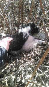 17.3.17 / Lensimme Serbian pääkaupunkiin aamulennolla, ja sieltä ajoimme suoraan Dobojn yksityiselle tarhalle, Bosniaan. Ajomatka hidastui noin 40km päämäärästä, kun tiellä tuli vastaan -lukuisten yliajettujen eläinten lisäksi- viimeisillään tiinenä oleva narttu. Se juoksenteli valtatien varrella. Pysähdyimme, mutta yrityksistä huolimatta koiran kiinniotto ei valitettavasti onnistunut.. Lyhyen matkavälin jälkeen musta-valkoinen pentu kurkisteli pahvilaatikon takaa pienen kaatopaikan lähellä. Lähes kahden tunnin piikkipusikoissa konttaamisen jälkeen mukanamme lähti pelokas, likainen ja janoinen pentupoika.