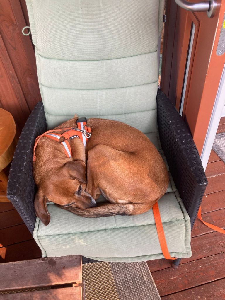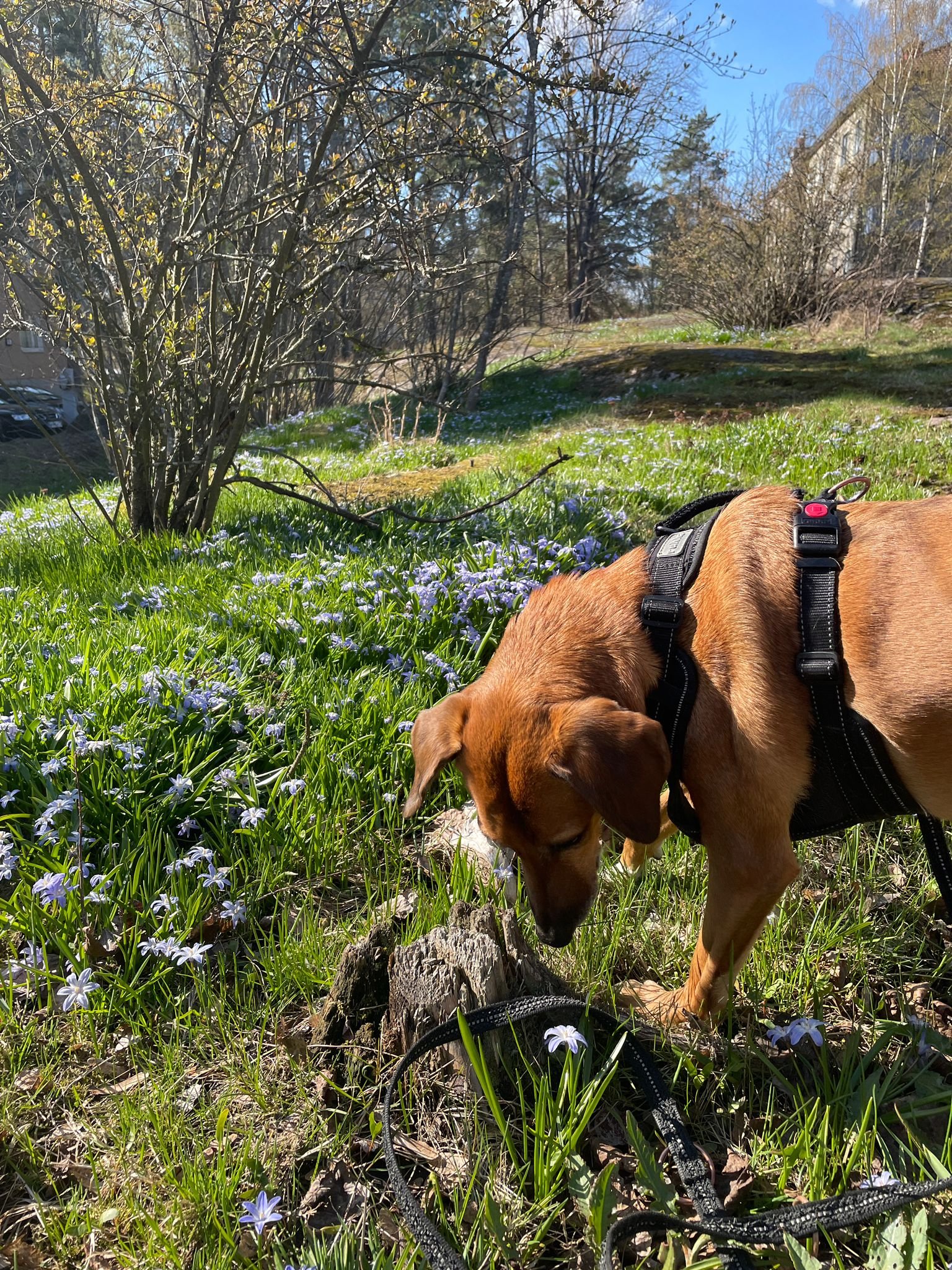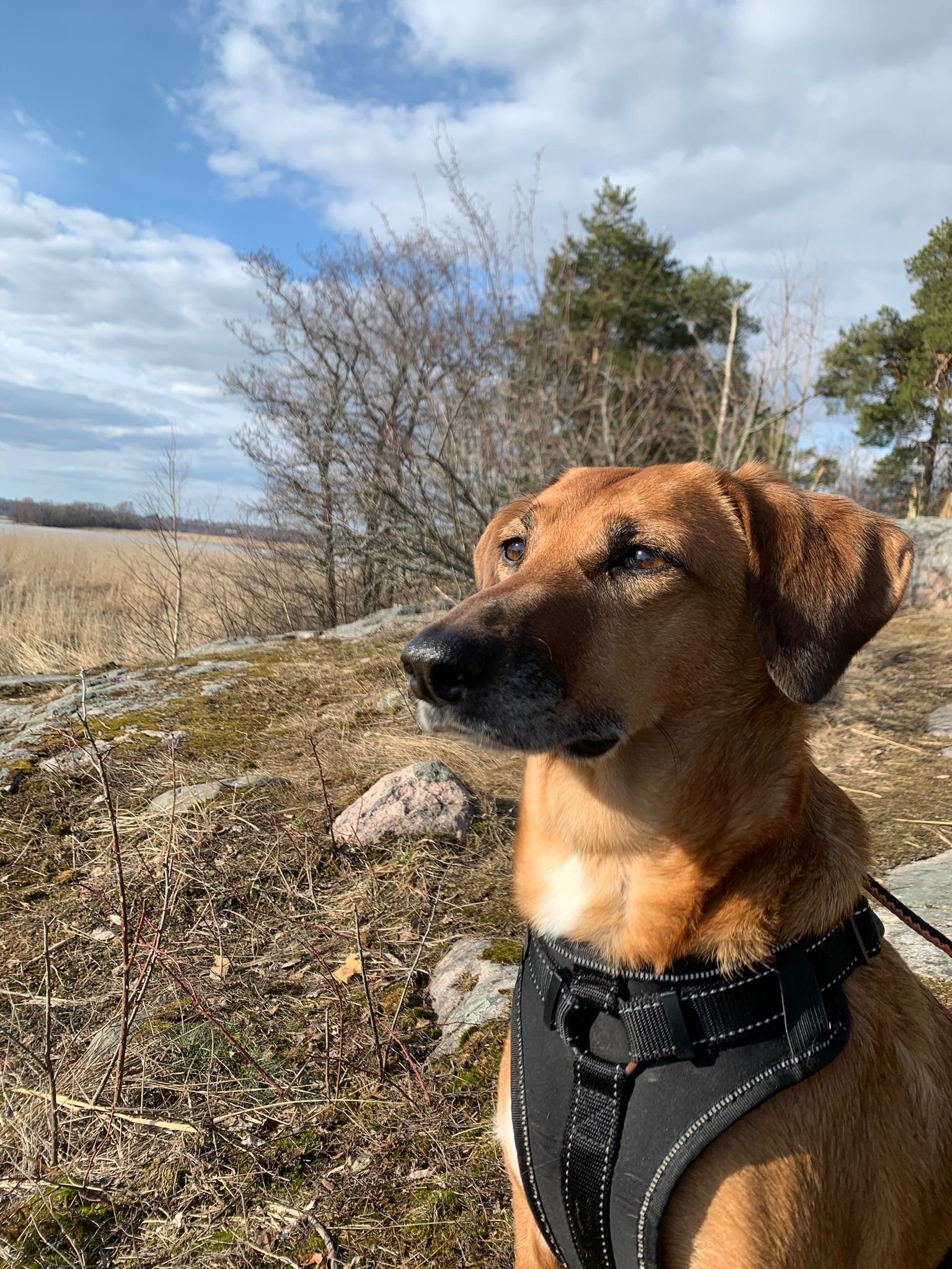 Bella on saanut myös ensimakua suomalaisesta mökkikulttuurista. Ja hän rakastaa mökkeilyä! Mökillä parasta on metsään ja luonnon hajujen haistelu ja auringossa makoilu. Onkin aivan ihanaa juoda kuppi kahvia kevät auringossa Bellan loikoillessa rauhallisena vieressä.