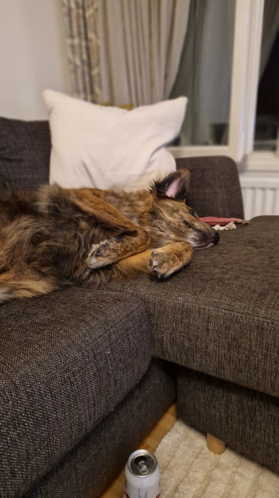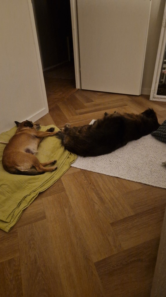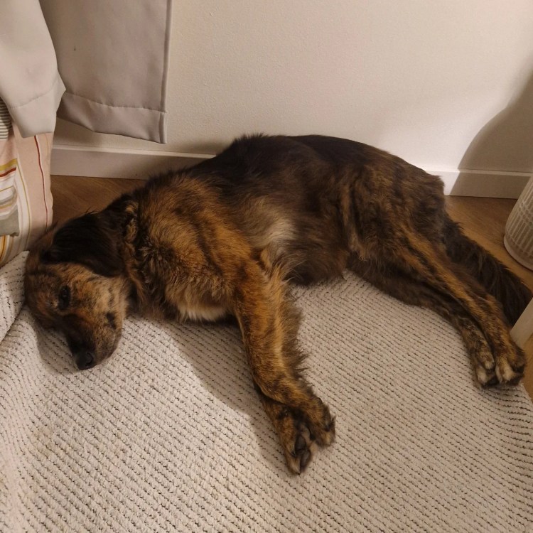 Kerrostalossa Zaki vielä öisin välillä reagoi ääniin, mutta tilan rajaaminen makuuhuoneeseen on auttanut häntä rauhoittumaan ja nukkumaan paremmin. Uni maistuukin oikein hyvin.