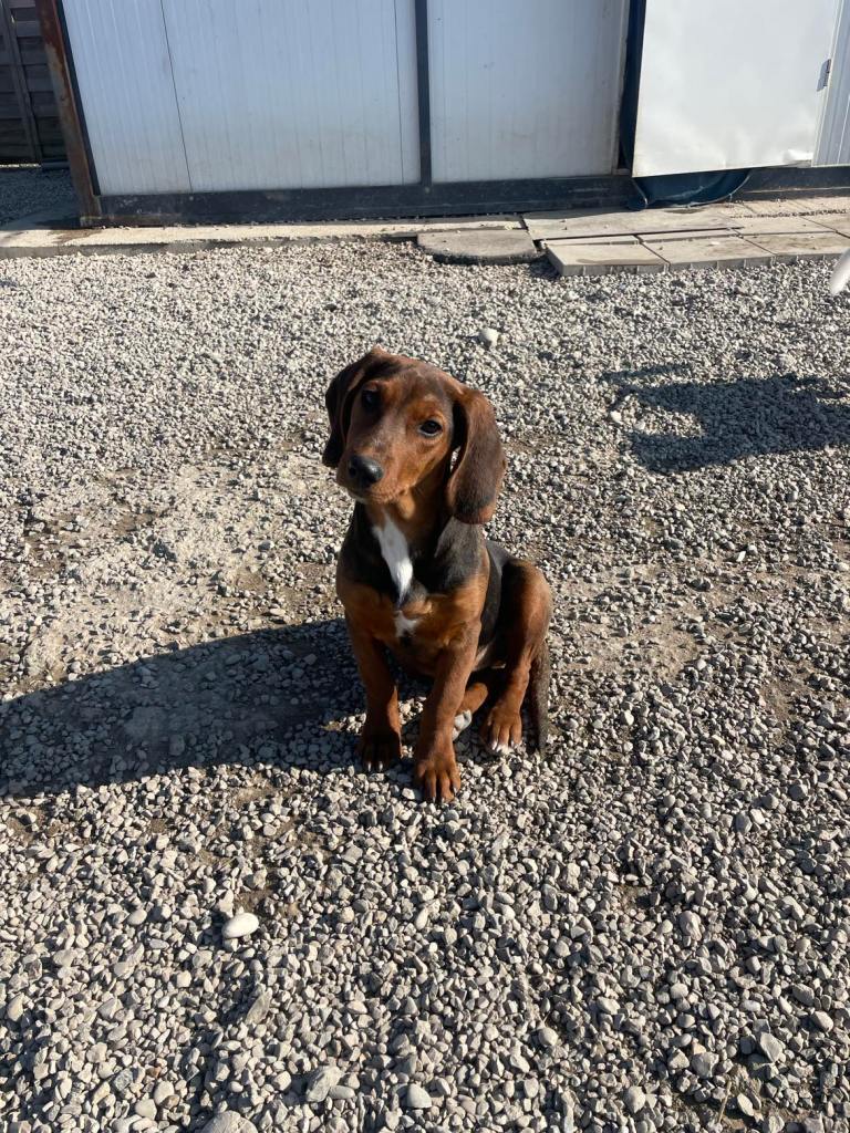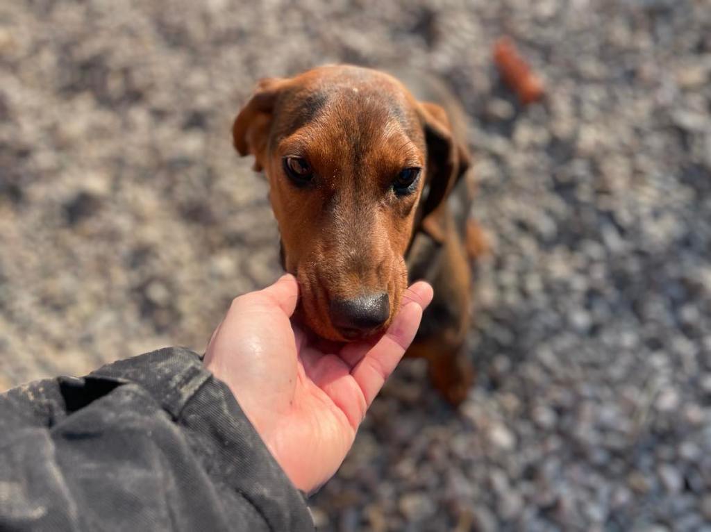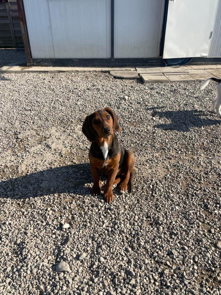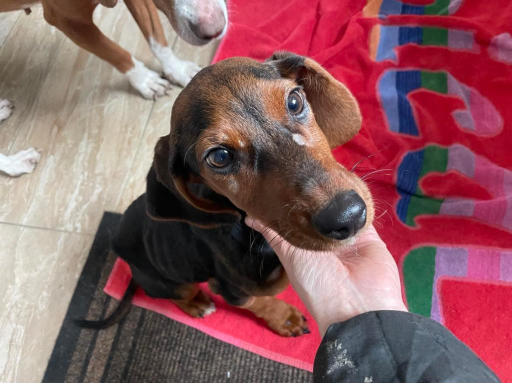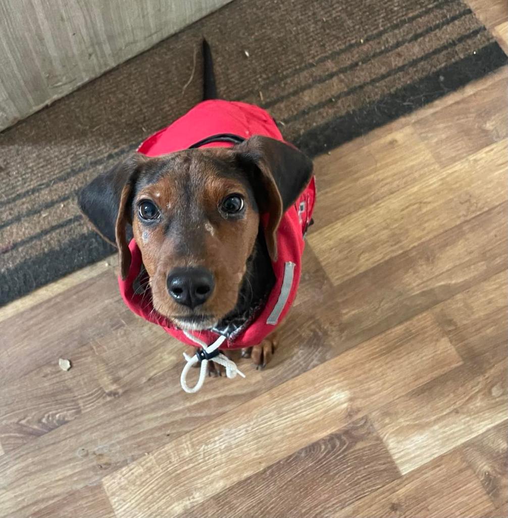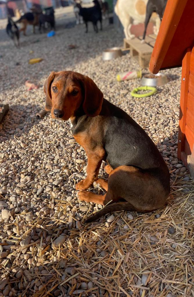 kuparinruskea valkoisilla merkeillä varustettu mäyräkoira. Lufuna oli tilapäisestä sijoituspaikastaan