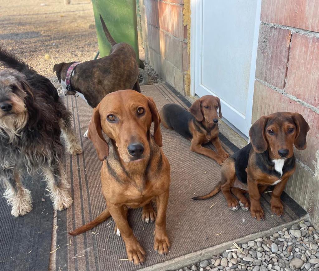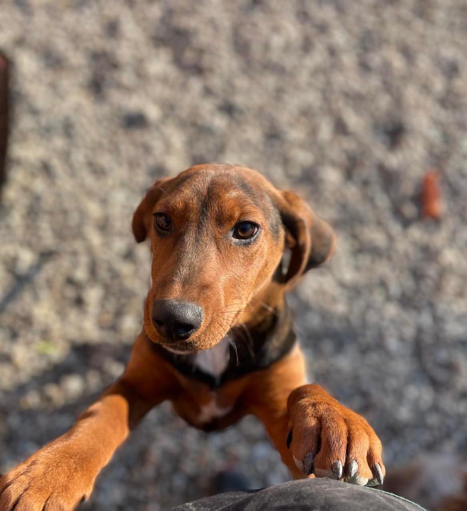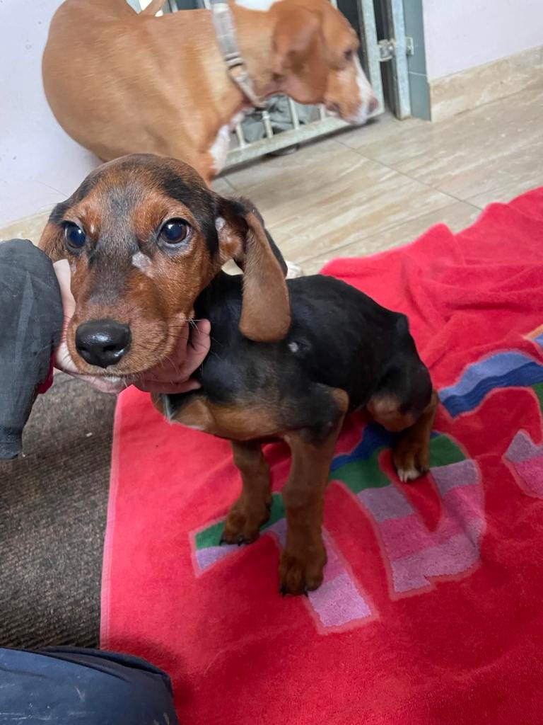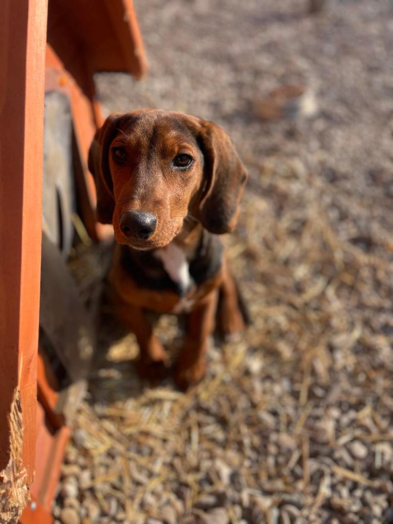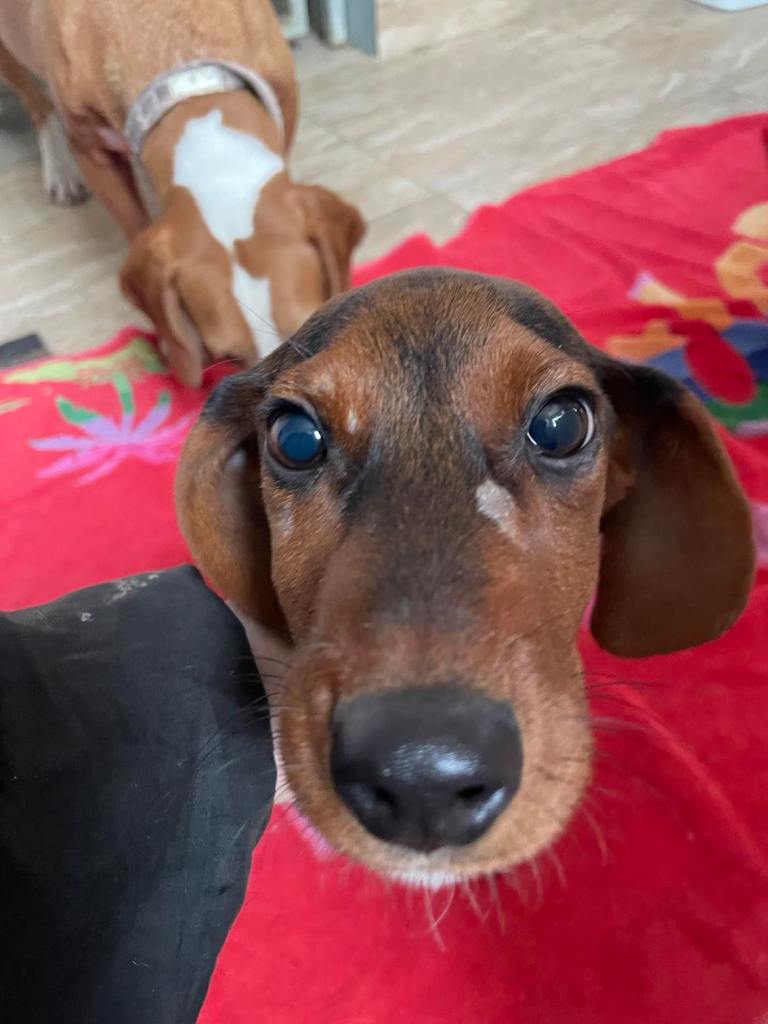 kuparinruskea valkoisilla merkeillä varustettu mäyräkoira. Lufuna oli tilapäisestä sijoituspaikastaan