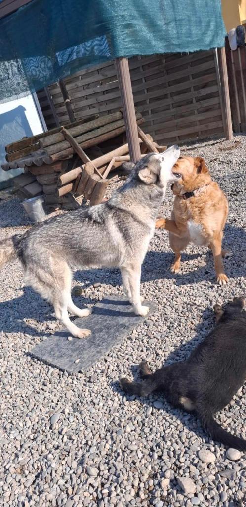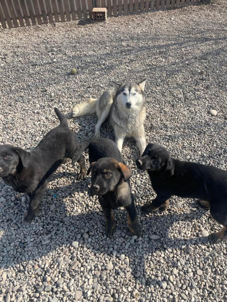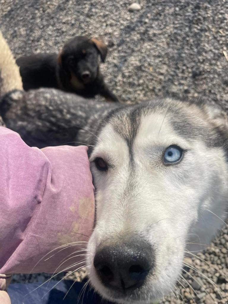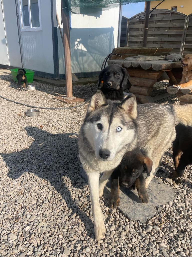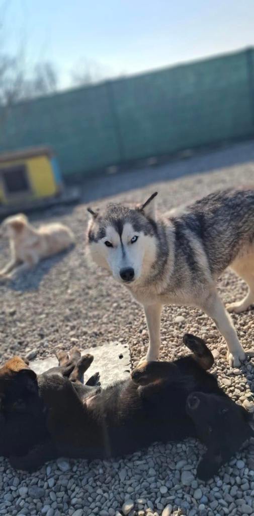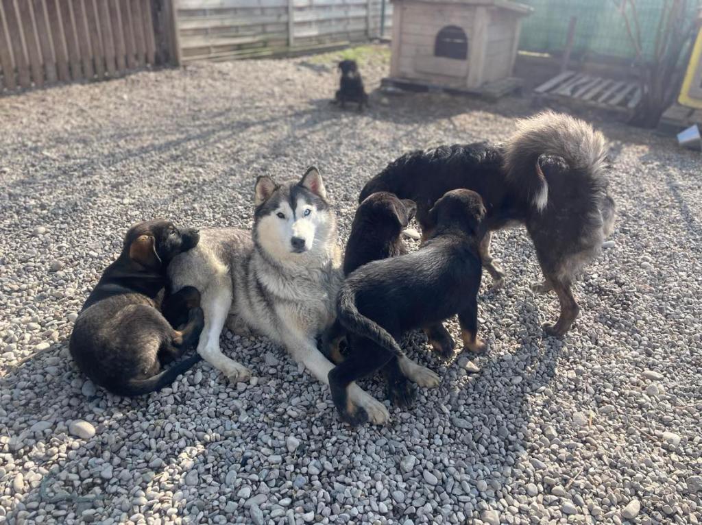 Stela on siberian husky, nuori, lempeä ja sopeutuvainen. Alkupäivinä Stela oli vähän ahdistunut uudessa paikassa, mutta pian hän tottui turvakodin ympäristöön sekä koiriin. Päästyään pienemmästä tilasta vapaaksi Stela alkoi asettumaan ja muutamassa päivässä hänestä tuli osa turvakodin edustan koiralaumaa 🙂 Stela on paljon rennompi ja tyytyväisen oloinen, kun hän pääsee liikkumaan vapaasti. Pian totesimme, että Stela ja pennut pärjäsivät muiden koirien kanssa eikä ollut enää tarvetta siirtää heitä pienempään aitaukseen. Stela valvoo omia pentuja ja leikkii heidän kanssa, mutta tykkää myös omasta rauhasta ja välillä hän onkin ihan omissa oloissaan eikä lähde seuraamaan pentuja, jos he lähtevät touhuskelemaan kauemmas. Stela ja pennut oppivat heti menemään lämmitettyyn konttiin yön ajaksi, ja siellä he nukkuvatkin yhdessä isossa kasassa. Stela tulee hyvin toimeen muiden koirien kanssa.