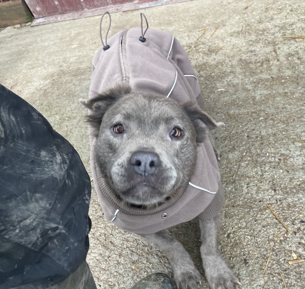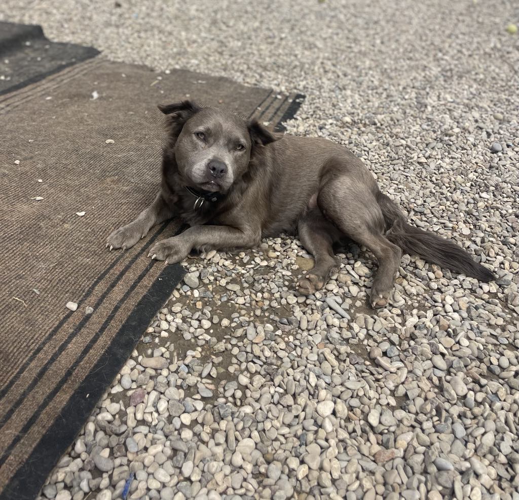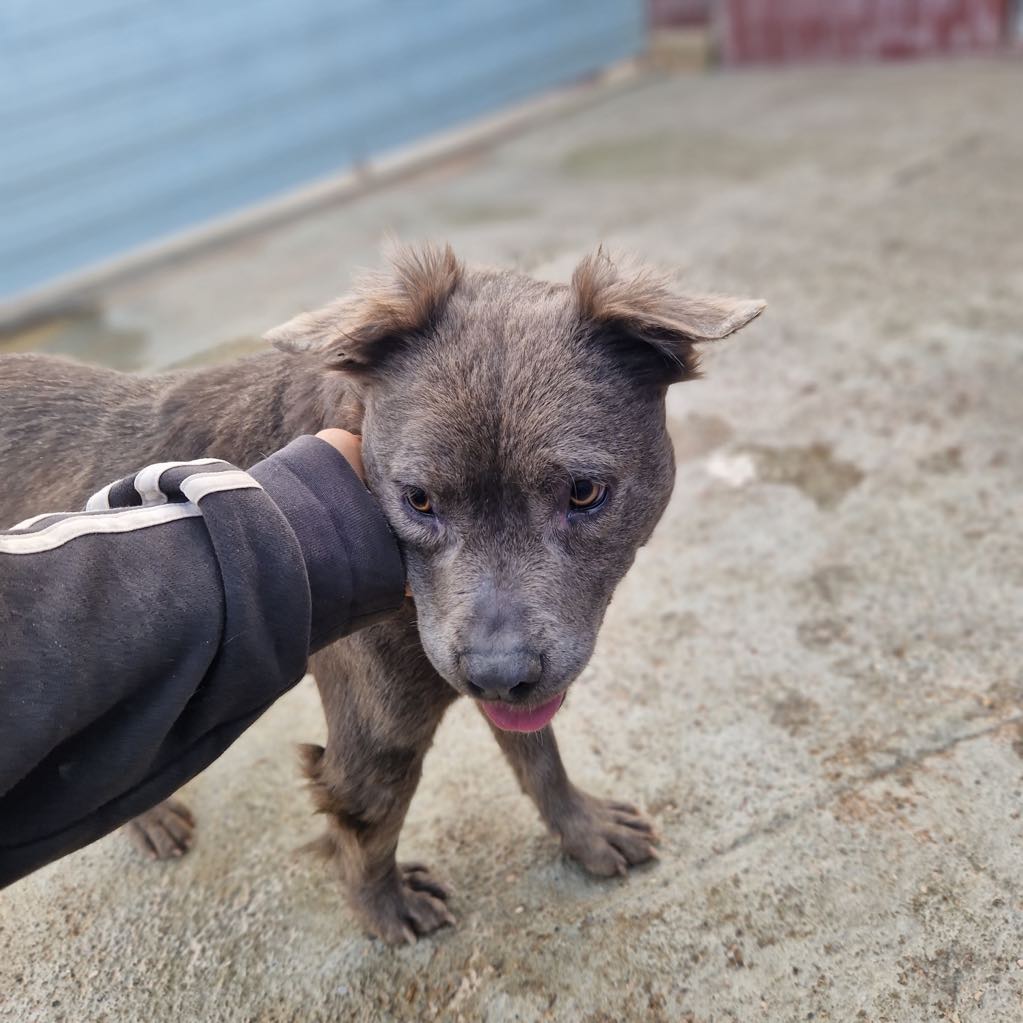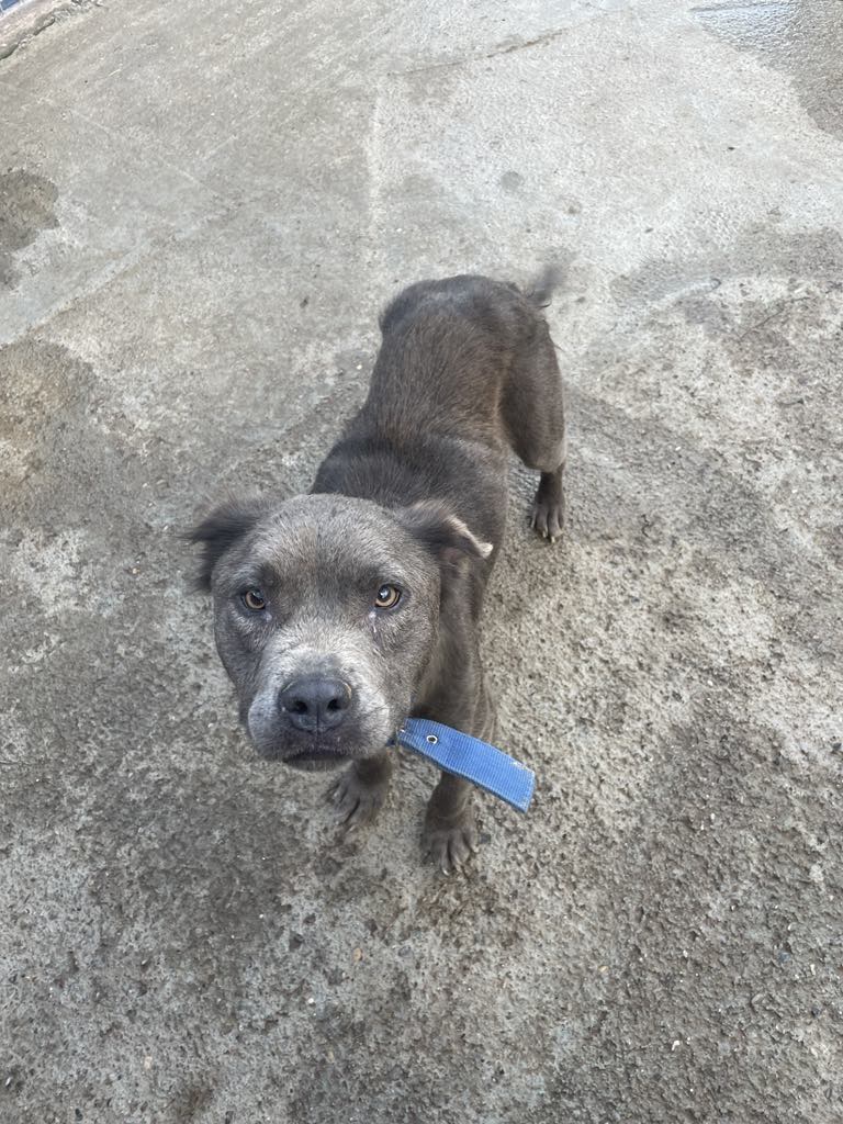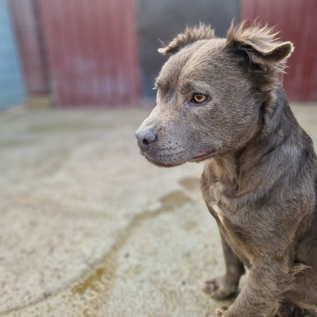 Laalaa on ainutlaatuinen harmaa staffi-mix tyttö, jolla on tavallista pitempi harmaa karvoitus.