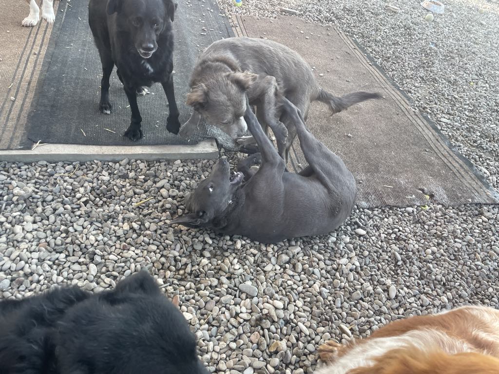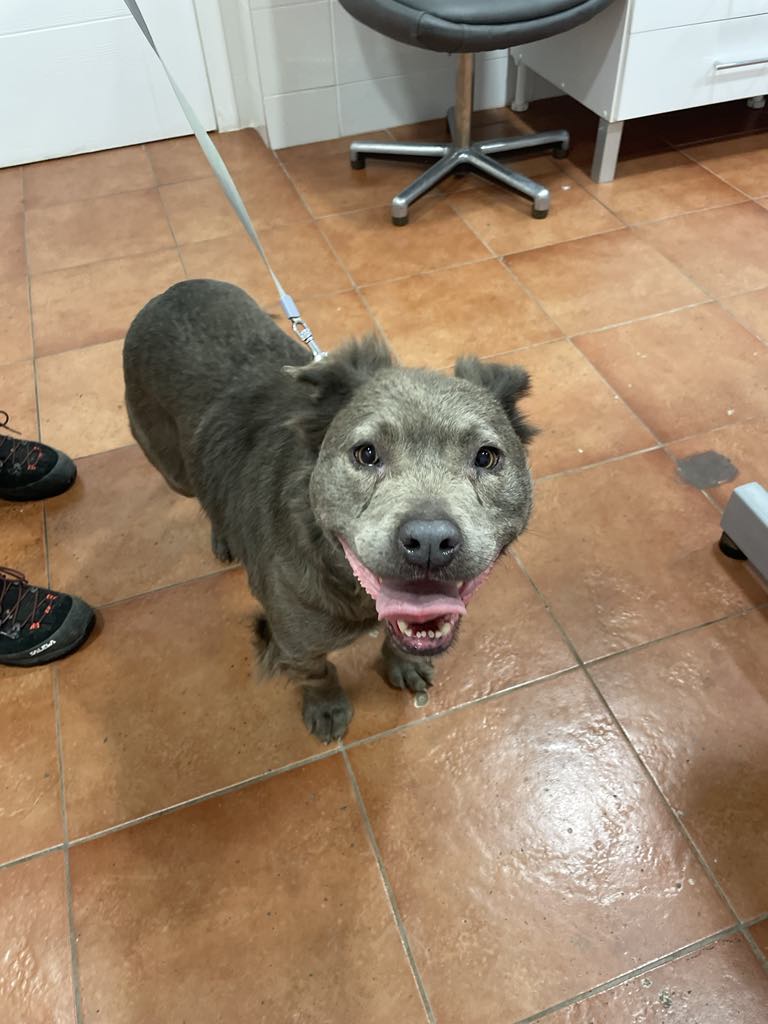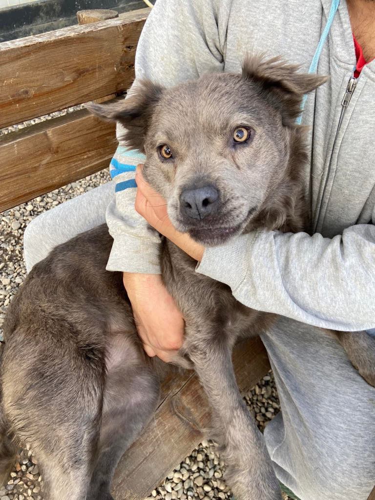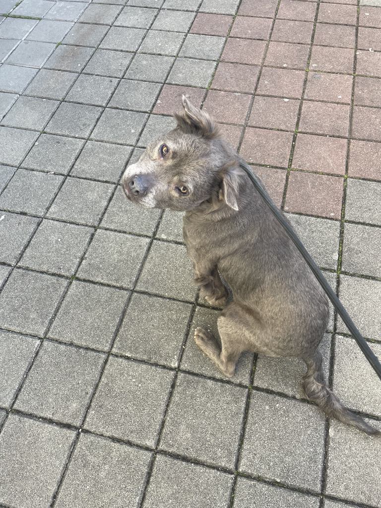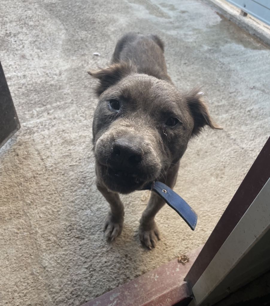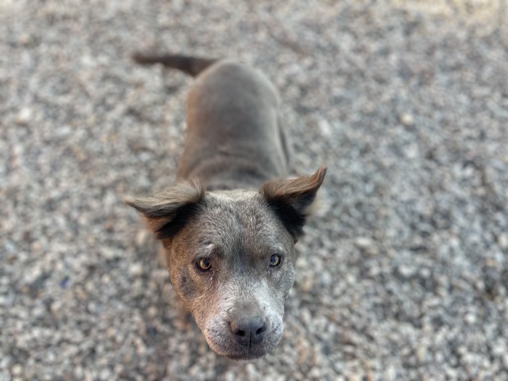 Laalaa on ainutlaatuinen harmaa staffi-mix tyttö, jolla on tavallista pitempi harmaa karvoitus.