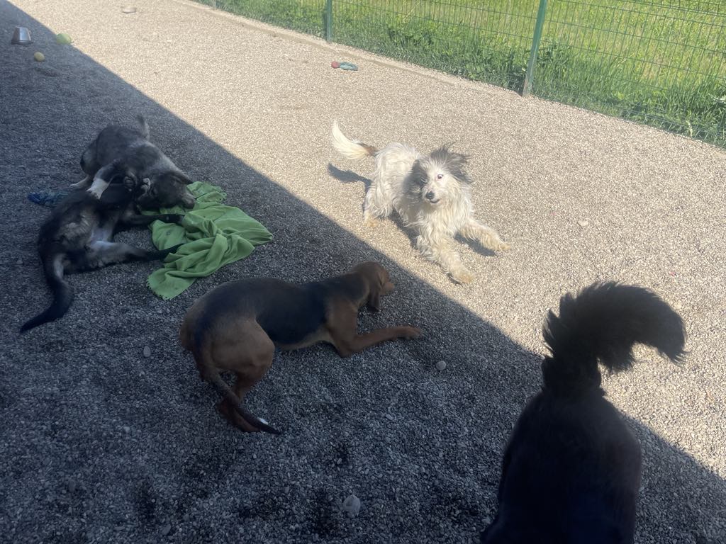 lähettyviltään. Nykyisin pikkuinen tyttö osallistuu innokkaasti leikkeihin, juoksentelee toisten koirien