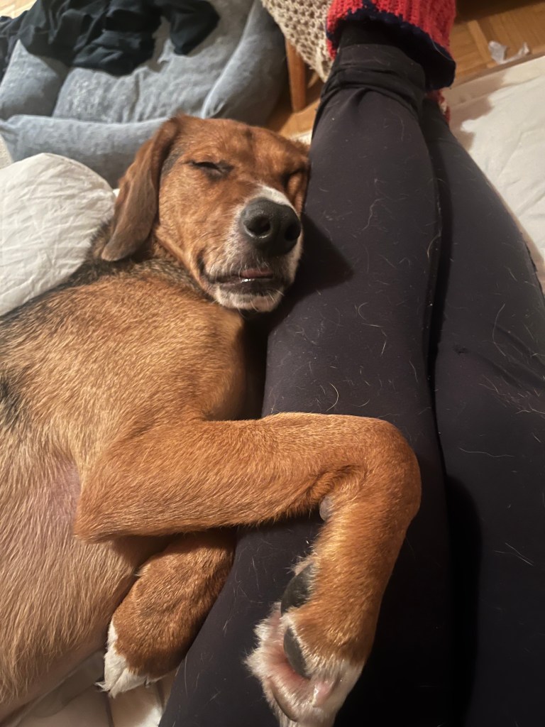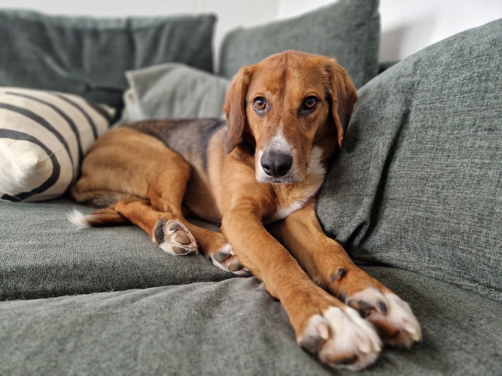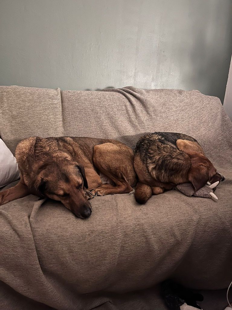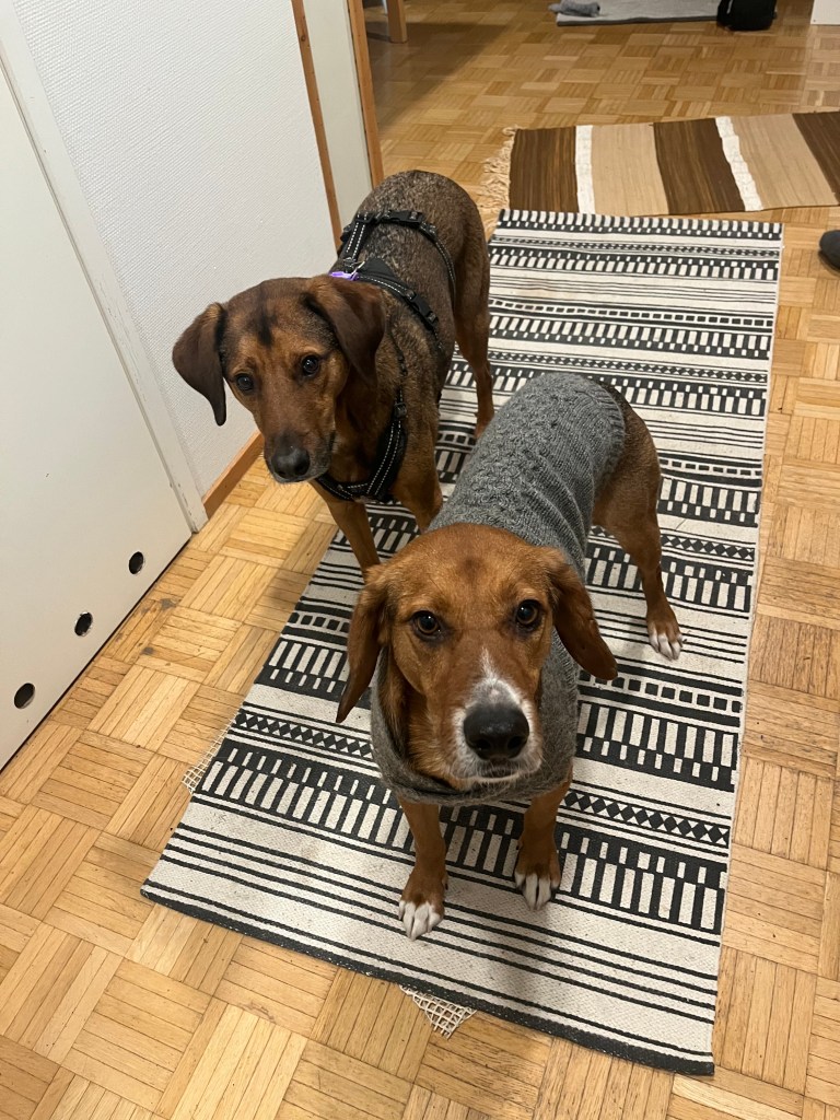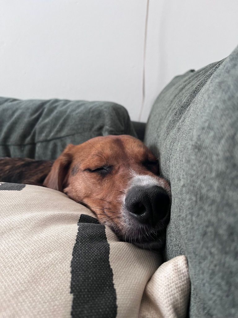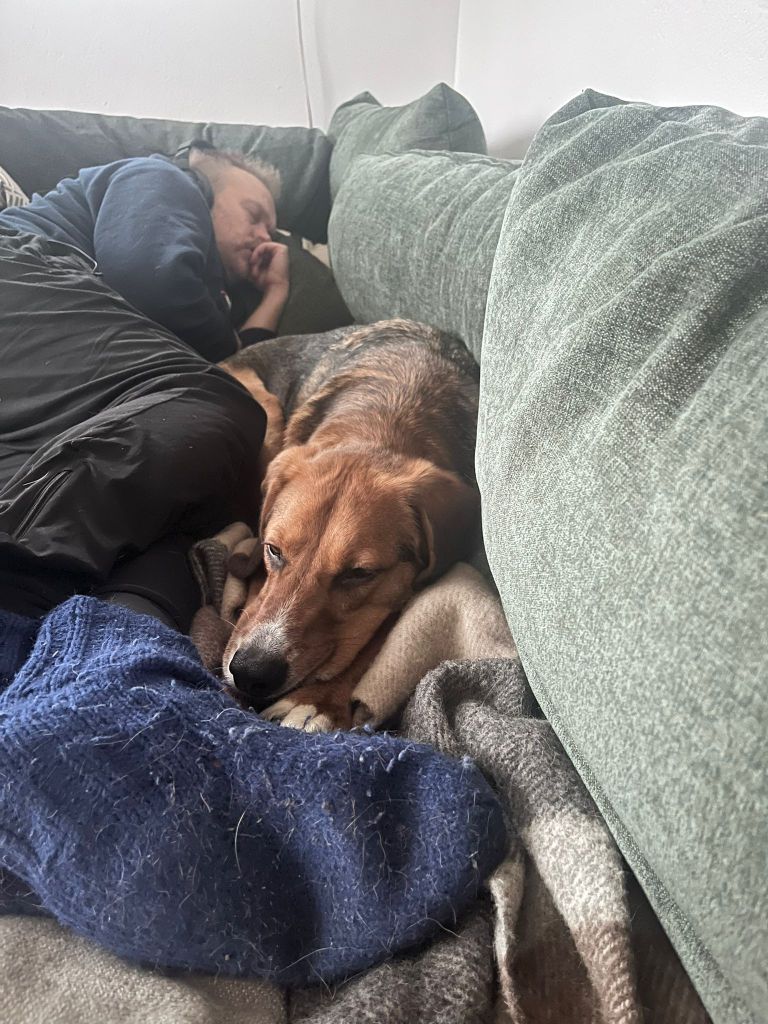 Olin todella onnellinen, kun viiden pitkän tarhalla vietetyn vuoden jälkeen, Rufi saapui Suomeen meille kotihoitoon 10.10.2024. Ennen asettumista helsinkiläiseen lähiöön, vietimme ensimmäiset viikot mökin rauhassa. Koska Rufi oli ollut turvakodilla kovin arka, olimme varautuneet, että Rufi viettäisi alkuun aikaa omaan rauhaan vetäytyneenä. Mitä vielä! Rufi tuli heti rapsuteltavaksi ja oli sitä mieltä, että nukkuminen omassa rauhassa on yliarvostettua ja pyrki heti muun lauman luokse. Ensimmäisen yön jälkeen Rufi onkin nukkunut kaikki yöt kosketusetäisyydellä, yleensä perhen miehen jalkoihin painautuneena ja välillä kainalossa.