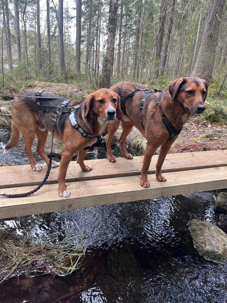 Rufi oli jo heti alkuun kovin utelias. Ulkoilu oli kiinnostavaa ja aina kun tulimme saunasta Rufilla oli hauska tapa köydä nuuskimassa jälkemme laiturilla ja missä olimme liikkuneet. Rufi tuli heti ensimmäisestä päivästä alkaen loistavasti toimeen perheen muiden koirien kanssa, veljensä Ruunon ja saman ikäisen Malva-tytön kanssa. Alkuun oli toki paljon pelottaviakin asioita: ovet, keittiön äänet, kolahdukset ja käsien nostaminen. Nämä ovat kuitenkin muuten jo mennyttä elämää, mutta kolahduksiin ja tiettyihin ääniin Rufi edelleen reagoi poistumalla vilkkaan paikalta. Mutta vuoden aikana uteliaan pojan resilienssi on kasvanut ja hän palaa entistä nopeammin takaisin paikalle ”Mitä sä äippä taas sähläät? Ps. Olisko namia?” ![]()
