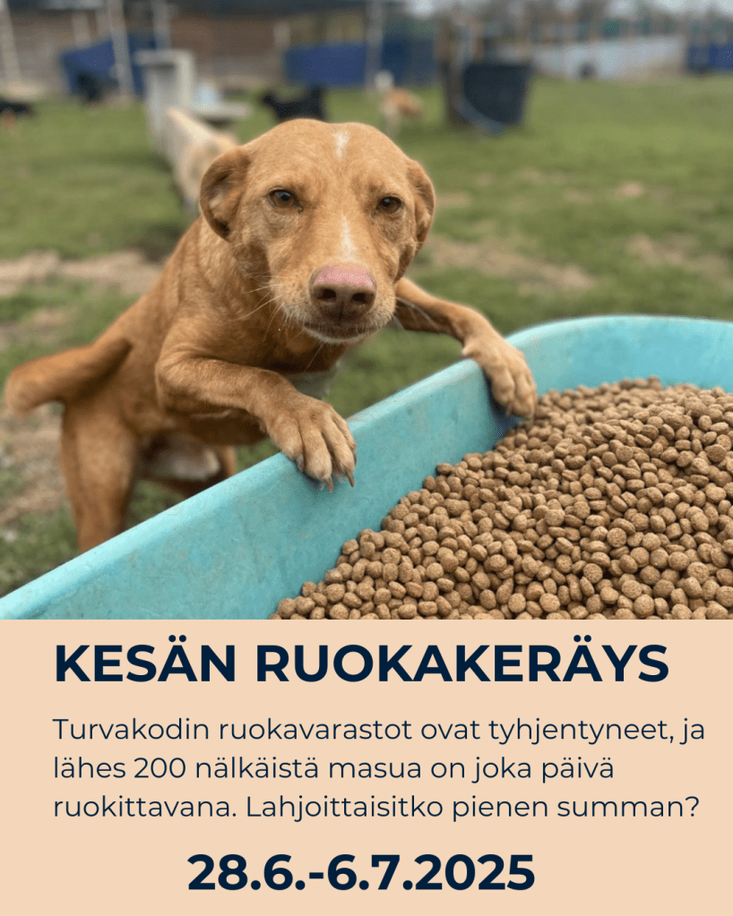 Yhdistyksemme turvakodilla asuu lähes 200 koditonta koiraa, jotka elävät täysin saamiemme lahjoitusten varassa. Tällä hetkellä turvakodin ruokatilanne on kriittinen, ja pyydämmekin nyt apuanne, jotta saamme turvakodin koirien kupit täytettyä seuraavien kuumien kesäkuukausien ajan.