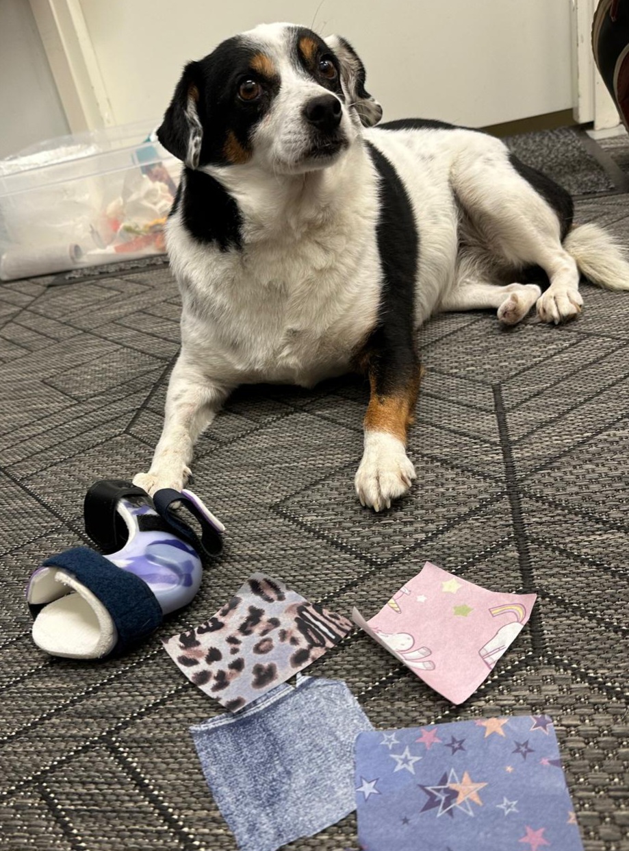 Tassutuen Sari valmisti kiltille ja yhteistyöhaluiselle pikkuasiakkaalle laskettelumonoa muistuttavan töppösen, joka on helppo pukea, pysyy (aika hyvin) matkassa mukana ja – mikä parasta – Tiri ei vastustele sitä lainkaan! Päinvastoin, pikkumummo on saanut lisävirtaa jo ennestään iloiseen moottoriinsa: häntä heiluu entistä enemmän, ja uudella jalalla otetaan jo iloloikkia, pyrähdellään lumessa ja jaksetaan muun lauman mukana pidempiäkin lenkkejä. Eikä pakkanenkaan ole vastus!