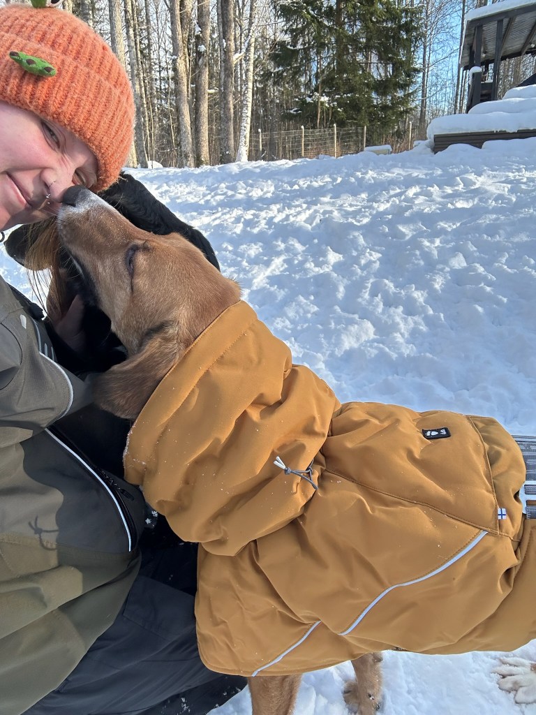Aku on selkeästi päässyt puhkeamaan kukkaan kotihoidossa. Etenkin lumikinokset ovat herättäneet Akun hilpeän puolen esiin ja hän voisi viettää tuntikausia lumikasoissa pyörien ja leikkien. Aku viihtyy muutenkin hurjan hyvin ulkona ja nauttii pitkistä metsäretkistä. Akusta saisi varmasti mainion kaverin myös pidemmille vaelluksille. Aku kulkee hihnassa äärettömän hienosti ja ohittaa muut koirat, ihmiset ja kulkuvälineet neutraalisti. Aku on opetettu ohittamaan muut hieman kiertäen, niin että muihin ulkoilijoihin ei oteta kontaktia. Metsästysviettiä poitsulla ei tunnu juurikaan olevan, vaikka jälkien nuuskuttelu onkin mielipuuhaa. Aku on nähnyt ulkona mm. peuroja, jäniksiä, oravia, lintuja ja satunnaisia vapaana ulkoilevia kissoja eikä ole reagoinut näihin mitenkään. Vieraat ihmiset ovat sisällä vielä hieman jännittäviä. Tällöin Aku tyytyy tarkkailemaan heitä omalta paikaltaan sohvalta. Sen sijaan ulkona Aku käy reippaasti tekemässä vieraisiinkin tuttavuutta ja kartoittamassa josko herkkuja olisi saatavilla. Oma tuttu kotihoitaja on Akulle turvallinen ja tärkeä tukipilari. Kun luottamus on ansaittu, Aku selkeästi kiintyy vahvasti ihmisiin. Akulle tärkeäksi rutiiniksi on muodostunut mm. aamurapsutukset ja halit sängyssä, jonka jälkeen lähdetään porukalla laittamaan aamupalaa.