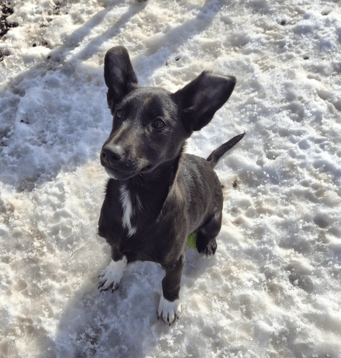 Kiiltävän musta turkki, pienet valkoiset sukat, komeat korvat ja ystävällinen luonne. Tällainen on