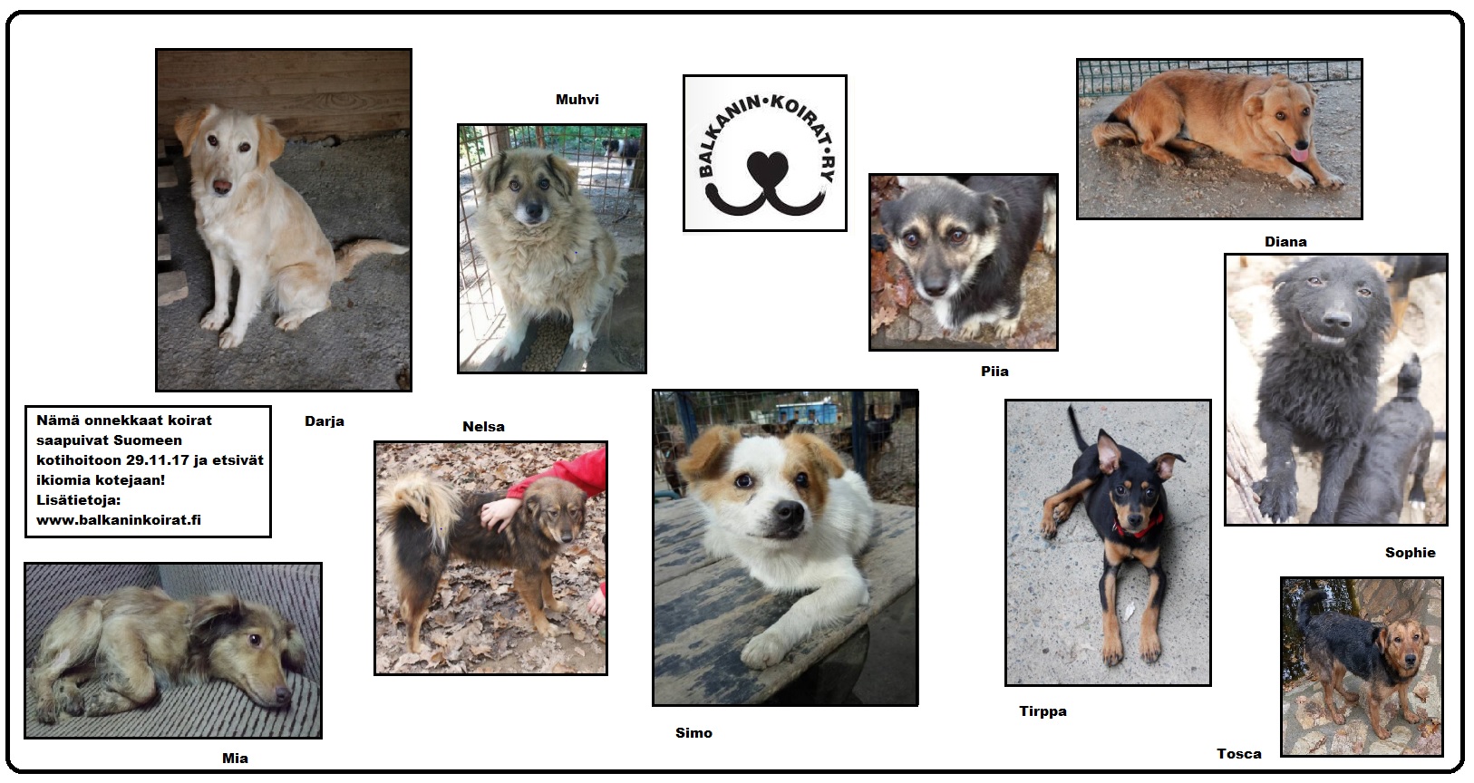 29.11.2017 saapui Bosniasta Suomeen 25 koiraa, joista 10 koiraa tuli kotihoitoon etsimään ikiomaa kotiaan 🙂